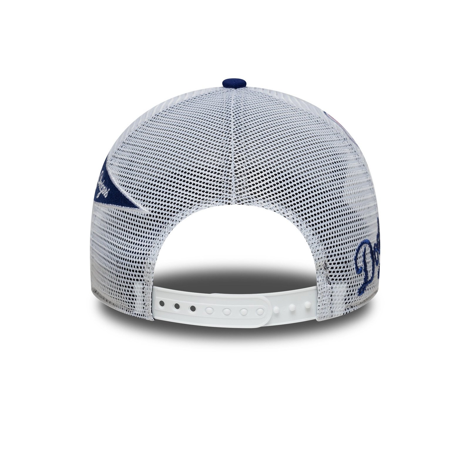 The structured dark blue crown offers a clean and sharp look, while the breathable mesh back panels provide comfort and ventilation. The front of the cap features the embroidered Los Angeles Dodgers logo, showcasing your support for the iconic team. The adjustable snapback closure ensures a customized fit, while the New Era flag on the left panel adds a finishing touch to the design.