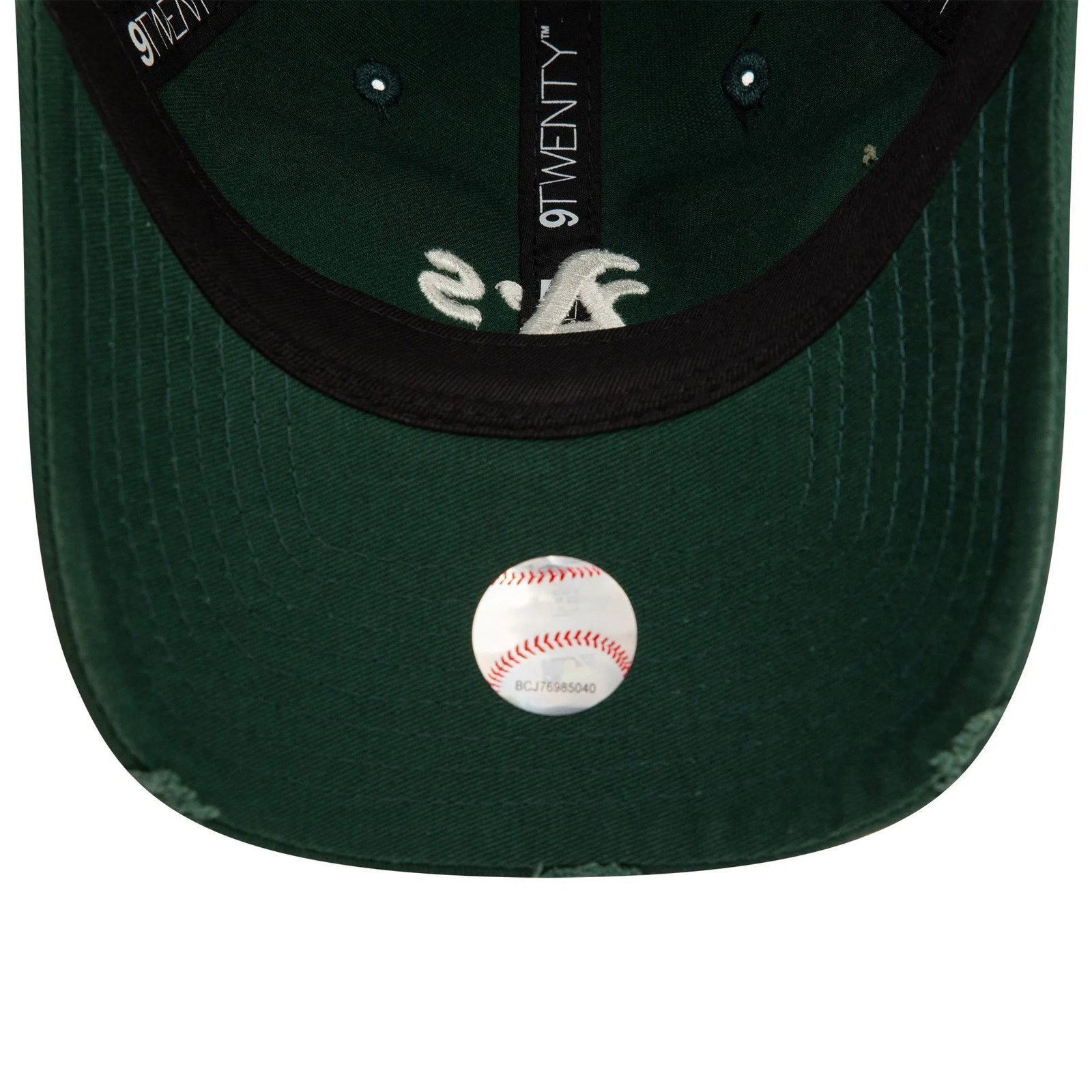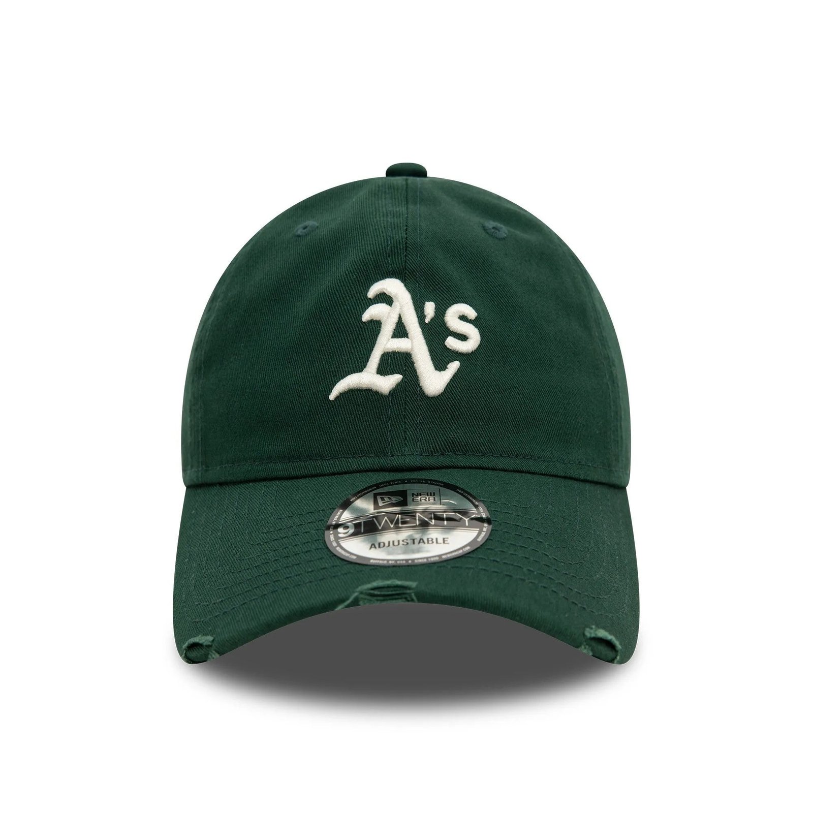 The New Era 9Twenty cap features an embroidered Oakland Athletics logo at the front and an embroidered New Era flag on the left side. It comes in a stylish distressed dark green color, giving it a worn-in, vintage look. The adjustable strapback closure ensures a perfect fit, while the unstructured crown offers a relaxed and comfortable feel. Made from 100% cotton, it is soft, breathable, and perfect for everyday wear. The curved visor offers sun protection and adds to the overall style.
