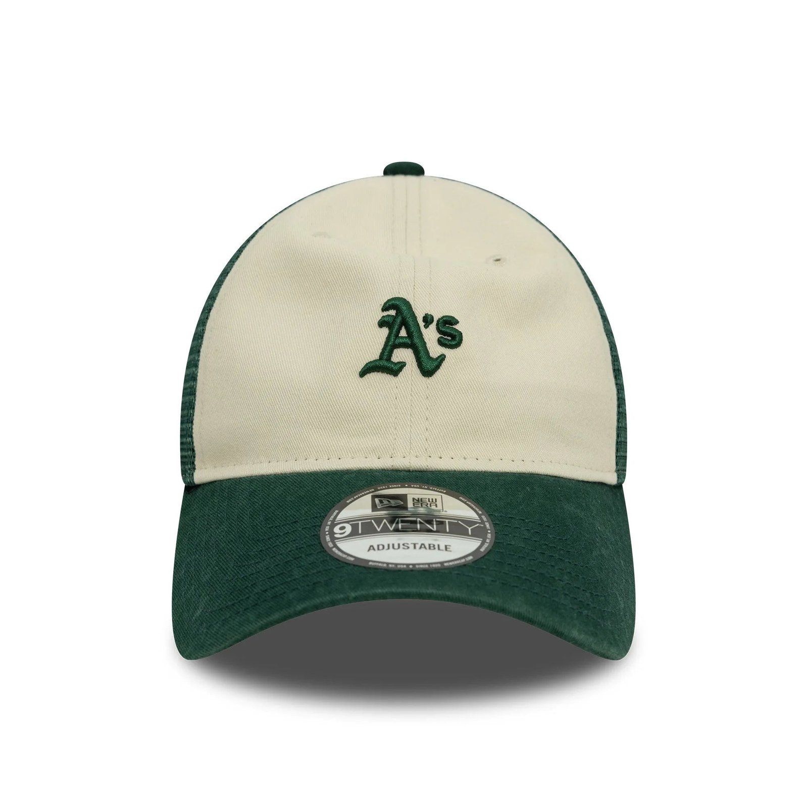The New Era 9Twenty Trucker Women cap features a classic embroidered Athletics logo at the front, with the New Era flag on the left side. This cap boasts a stylish two-tone color design that enhances its modern appeal. The adjustable snapback closure ensures a perfect fit, while the curved visor provides sun protection. Made with a blend of 100% cotton and 100% polyester mesh, this cap is both breathable and durable.